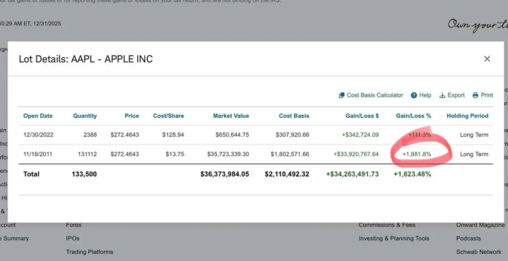 账号主人正是有“中国巴菲特”之称的段永平,截图里的两组数据格外扎眼:2011年11月买入的13万股苹果股票,成本13.75美元/股,如今账面价值3572万美元,收益率高达1881.8%;2022年12月加仓的2388股,也赚了34.3万美元,收益率111.3%。两个账号合计收益率超16倍,接近19倍的战绩让网友直呼“神话”。